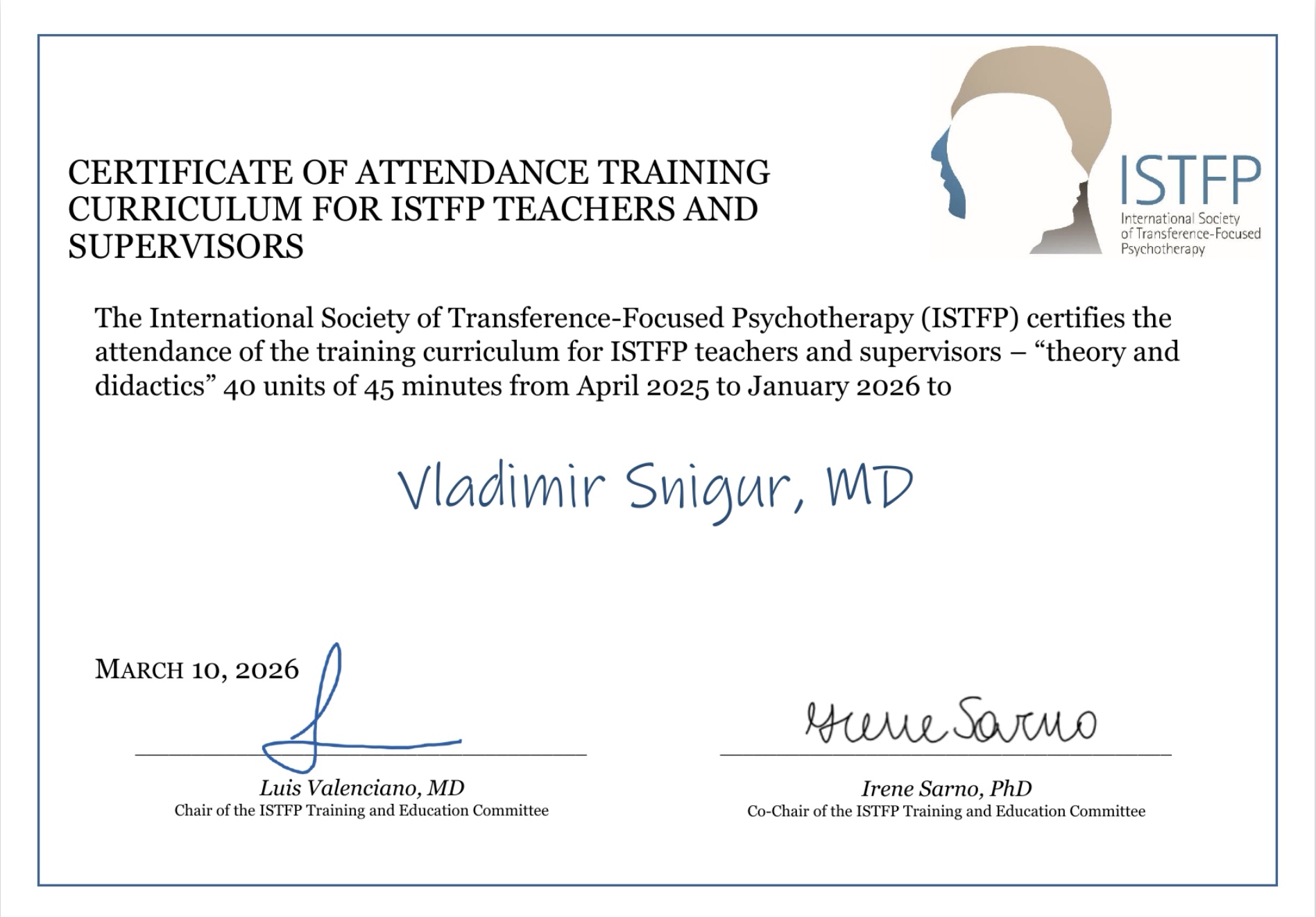 Обладатель сертификата ТФП-терапевта от Международного общества терапии фокусированной на переносе (ISTFP), продолжаю обучение на тренера-супервизора по ТФП